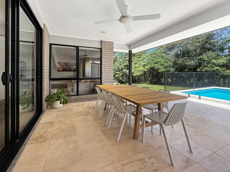Outdoor living is a true highlight of the home. Bi-fold doors open from the main living area to the pool zone, creating seamless indoor-outdoor flow. A covered flyover entertaining area sits beside the saltwater pool, while an additional undercover outdoor space offers another relaxed setting overlooking the water - perfect for entertaining or watching the kids play. Sandstone stepping stones lead through the landscaped surrounds to a large, grassed area, providing plenty of space for children to run and enjoy the outdoors.