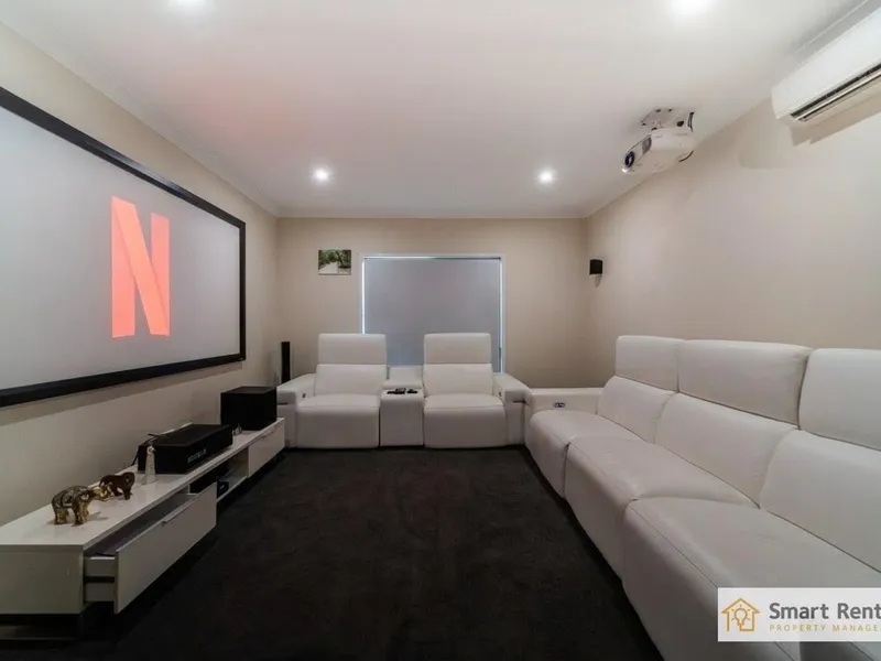 - Multiple living zones including theatre room with projector
