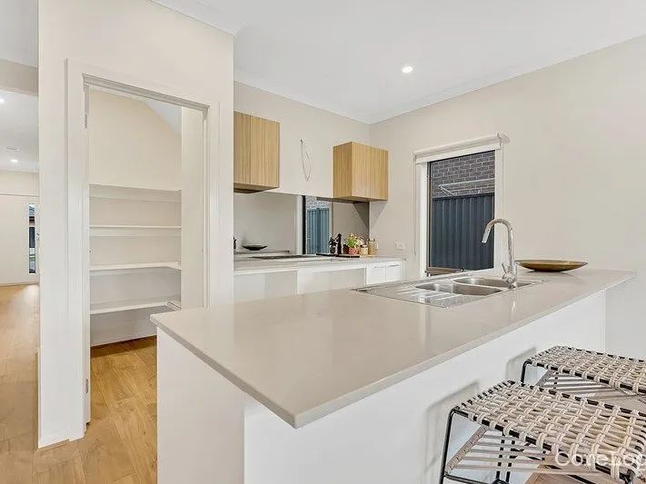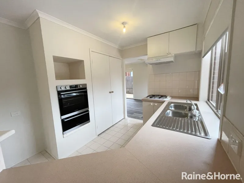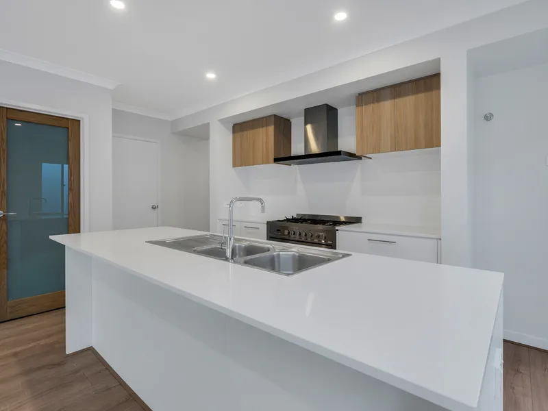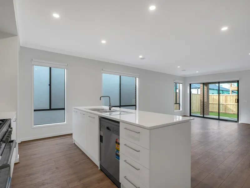 At the heart of the home is the well-appointed kitchen, complete with contemporary fixtures, quality appliances, and ample storage. The open-plan living and dining area creates a warm and inviting environment, perfect for both relaxed family living and entertaining guests.