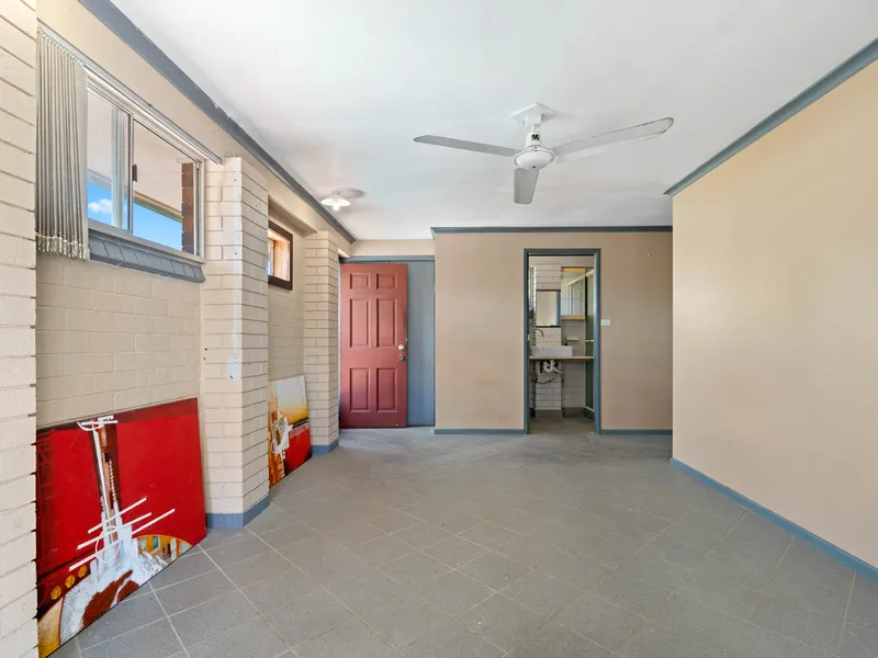 The main residence features three well-sized bedrooms, all with built-in wardrobes, while the master bedroom also includes air conditioning for additional comfort. The bathroom is practical and well maintained, accompanied by a separate toilet and a spacious internal laundry with extra storage.