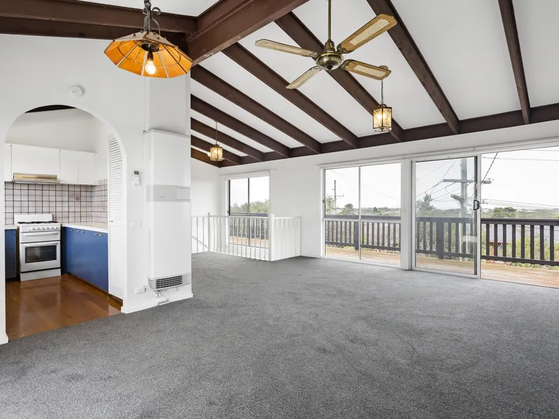 * Front deck showcasing stunning bay views, including Arthur's Seat vistas