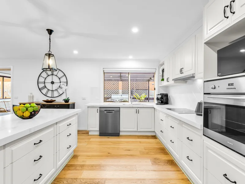 - Kitchen with gas cook top, dishwasher, oven and waterfall bench stone