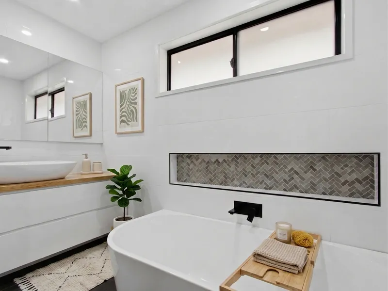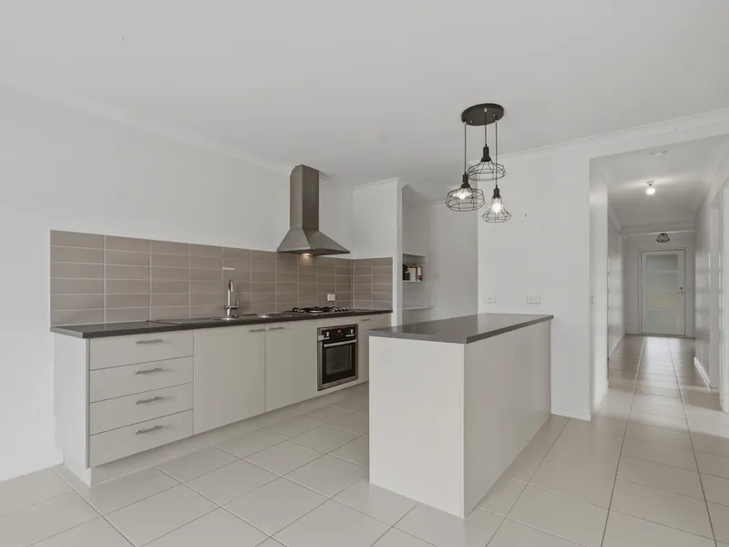 Inside, you’ll find three generous bedrooms with built-in robes, including a master bedroom complete with a ensuite featuring a frameless walk-in shower, large vanity, and floor-to-ceiling tiles. The home is serviced by a central bathroom, showcasing a back-to-wall freestanding bath, walk-in shower, and large vanity.