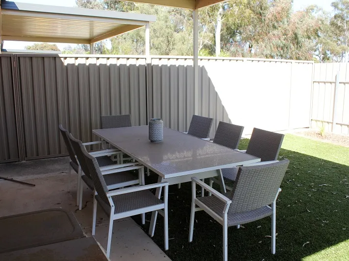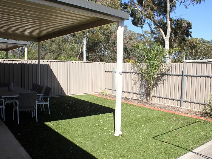 Private fenced yard with artificial turf