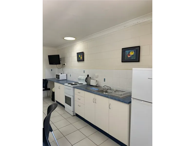 The studio unit is fully equipped with Stove, fridge/freezer, TV, Queen bed, two seater sofa, dining area and bathroom.