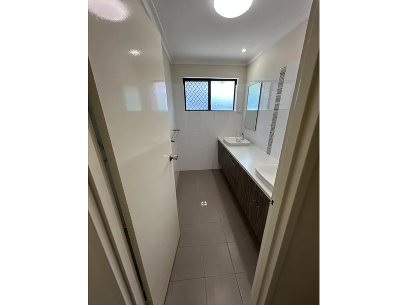 The modern bathroom complements the home with sleek finishes and double storage, keeping everything neatly in place.