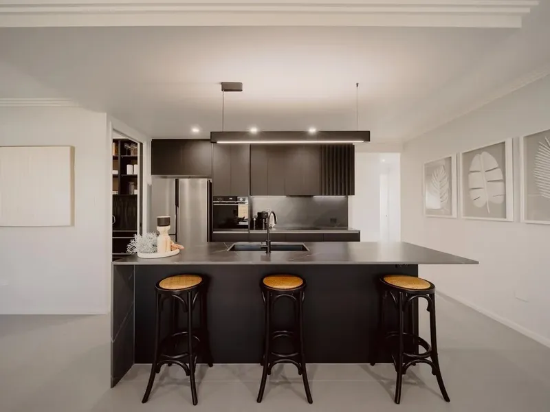 The heart of the home features a striking modern kitchen with premium appliances, and a large island breakfast bar, and butler's pantry flowing seamlessly into the open-plan living and dining area. Large windows and sliding doors create a light-filled space that connects beautifully to the outdoor entertaining area.