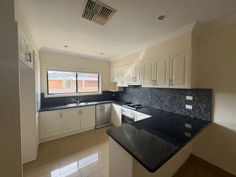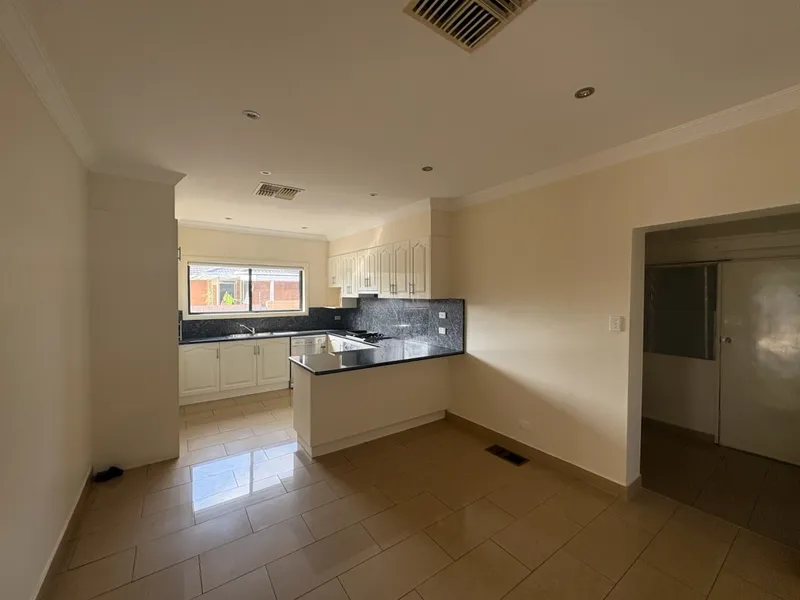 Featuring three spacious bedrooms, all with built-in robes, and a welcoming living area at the front of the home. The modern kitchen boasts a gas cooktop, dishwasher, and ample storage, seamlessly connecting to the adjoining meals area.