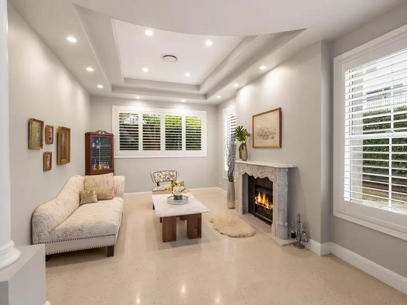 - Carrara Marble wood fireplace in The Grand Room, coffered ceiling.