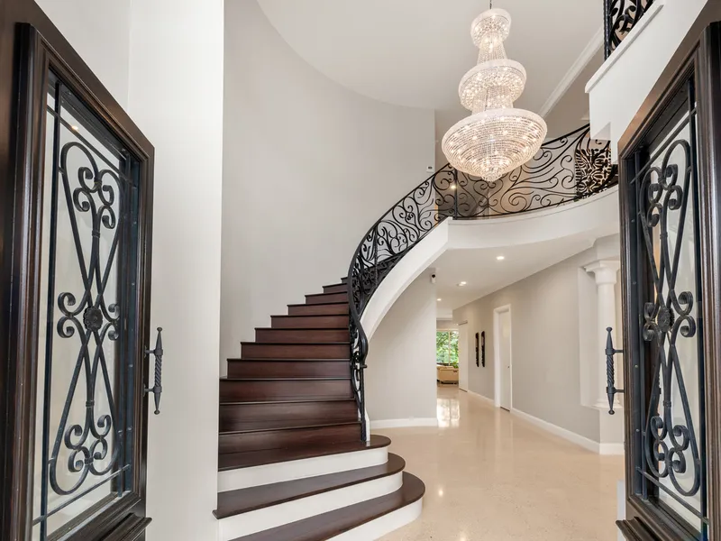 - Upon entry a self-designed chandelier, polished concrete floors which lead to a curved, dark-stained bamboo floored staircase with hand-made wrought iron railings.