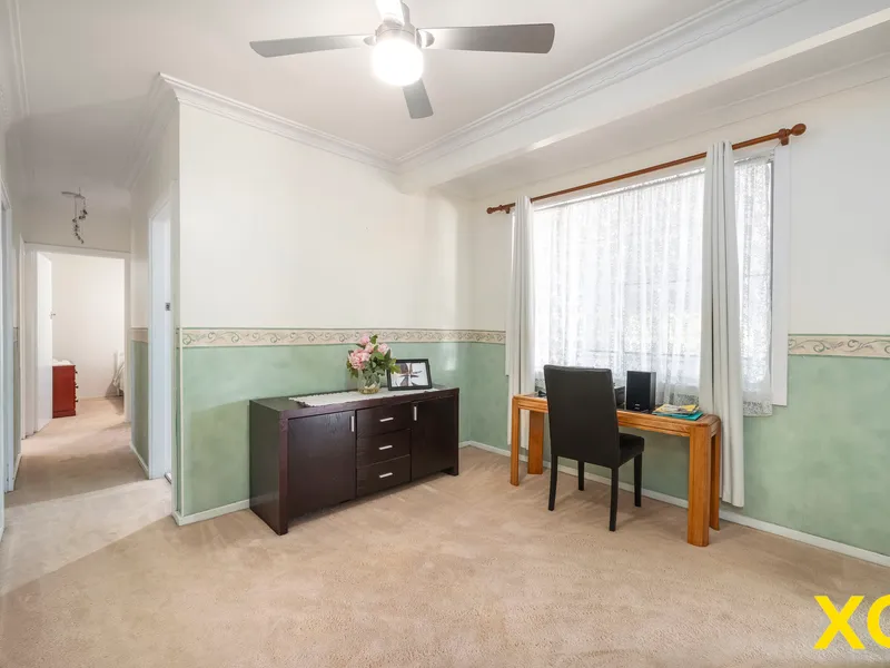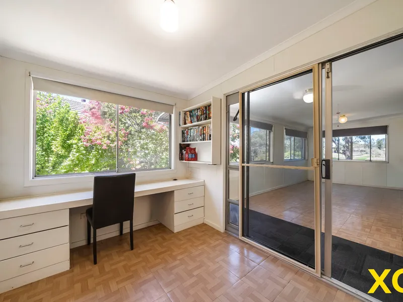 Double-glazed windows assist in temperature control and in maintaining a quiet interior. The three bedrooms all have ceiling fans, and the main bedroom includes a split system air-conditioner. An open plan living and dining room is an inviting, light-filled space. Adjacent to this is the kitchen, with brightly coloured benchtops and great storage. Towards the rear of the house is a good-sized study and an airy sunroom.