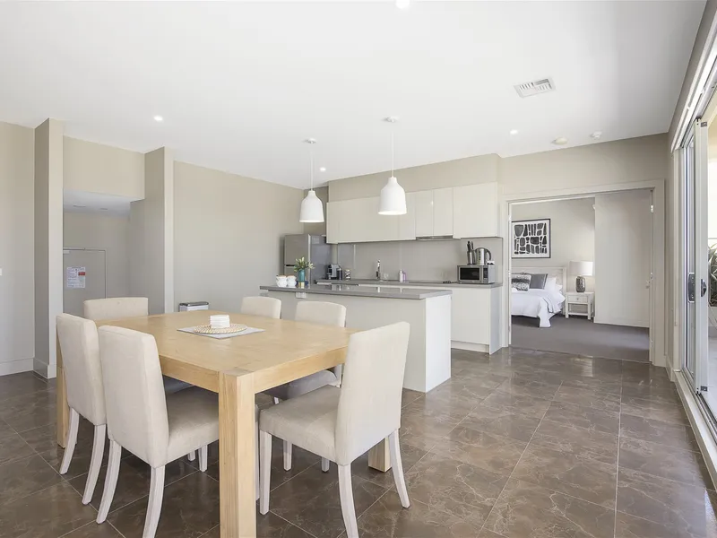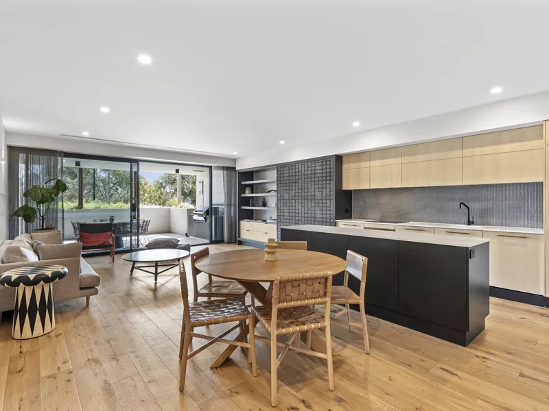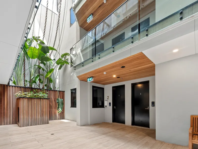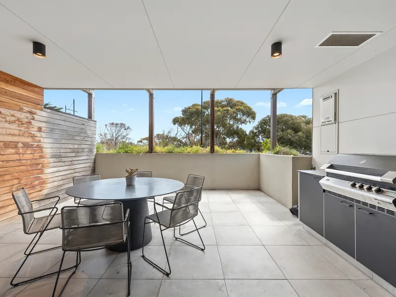 An inviting entry leads past the open plan kitchen, dining and lounge toward an expansive private balcony with BBQ, outdoor setting and views of the colourful and vibrant main street.