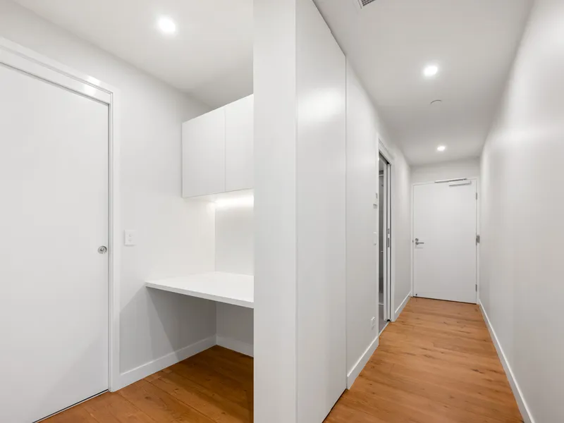 The apartment is also extremely well-appointed and offers, among other things, a custom designed chef’s kitchen, 2.7m plasterboard ceilings as well as full height double glazed external glass windows and doors. Timber flooring throughout the living area and bedrooms, a large bathroom and ensuite with extensive storage, fully ducted heating and air conditioning as well as 1 secure on-site car park.
