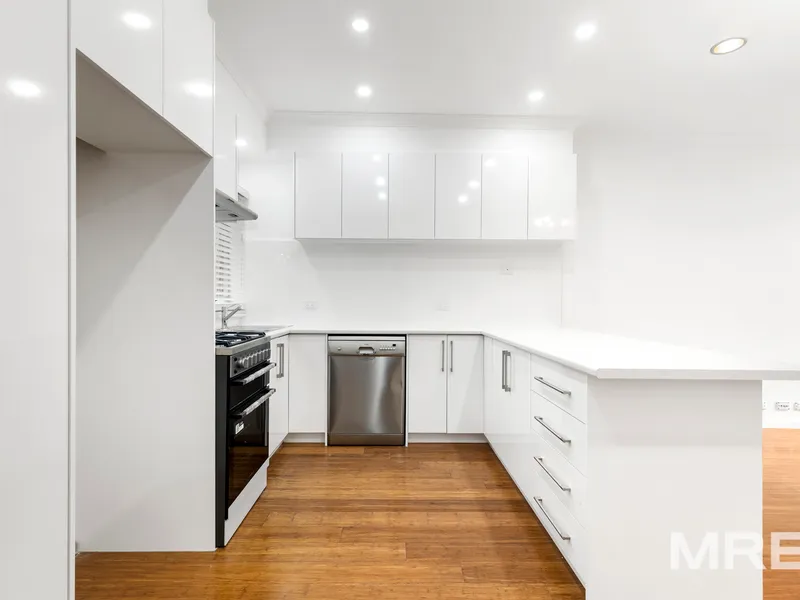 The well-appointed entertainer’s kitchen is finished with stone benchtops, quality appliances including a gas cooktop and dishwasher, and ample storage, ensuring both style and functionality.