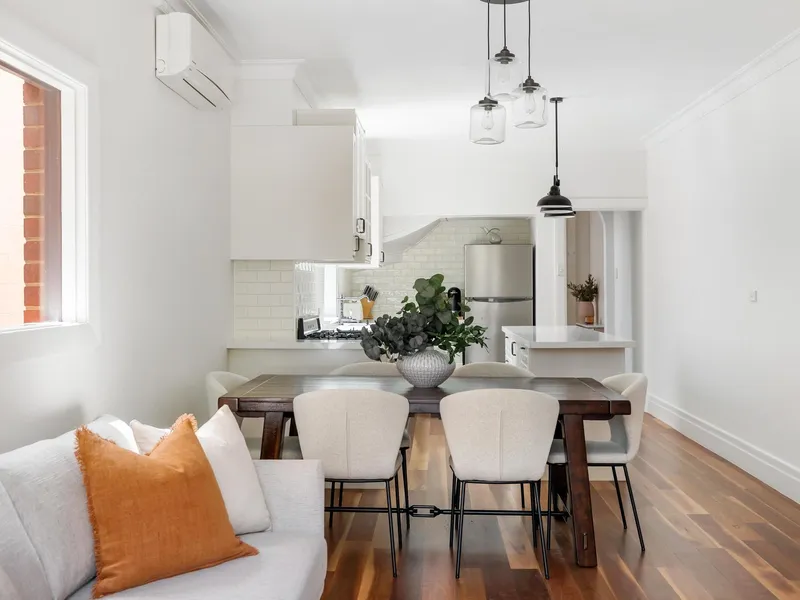 - Spacious open plan living and dining area with timber flooring and a generous balcony