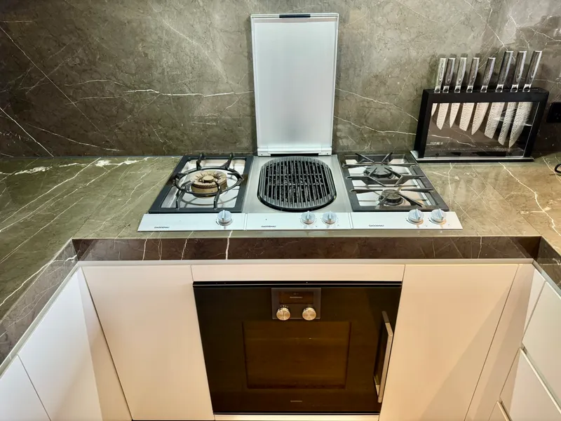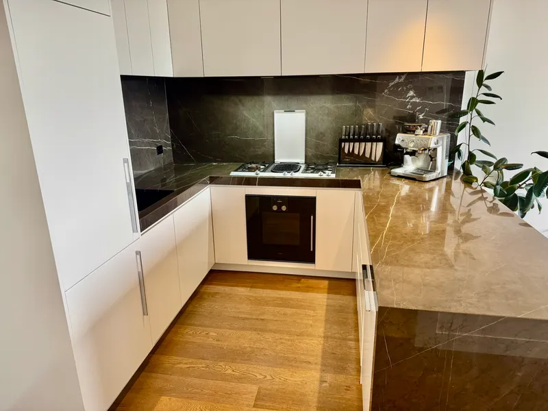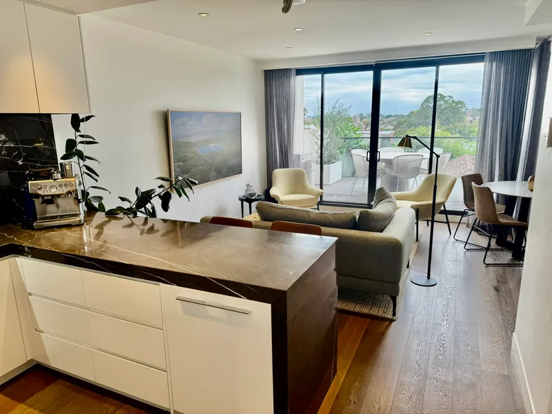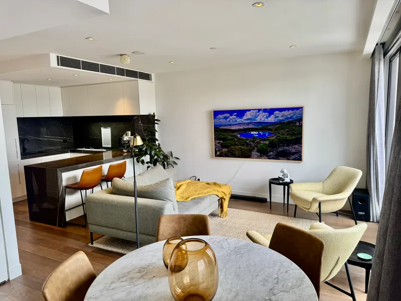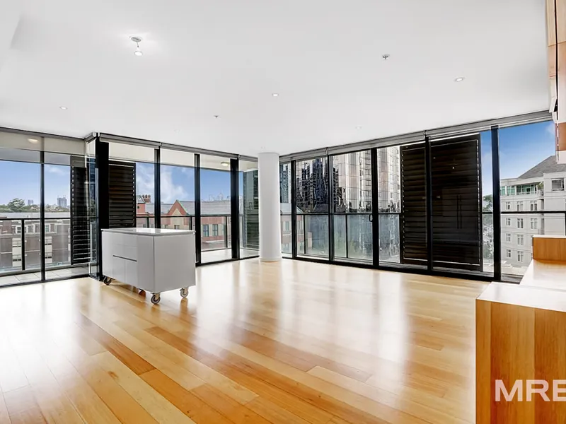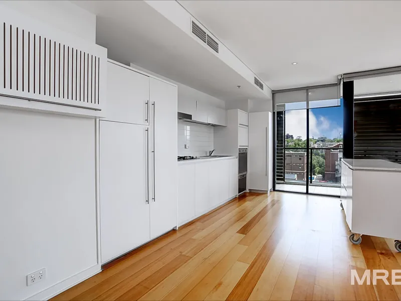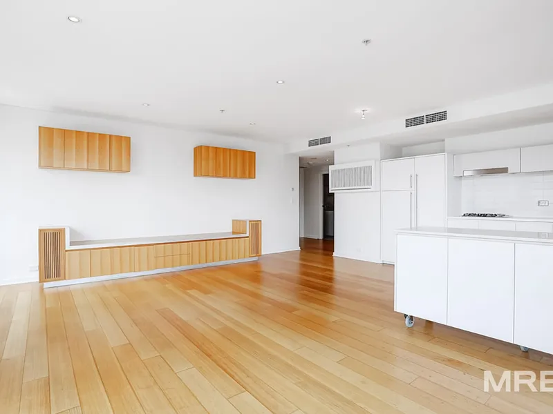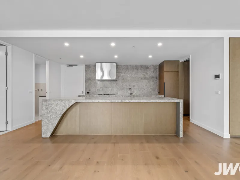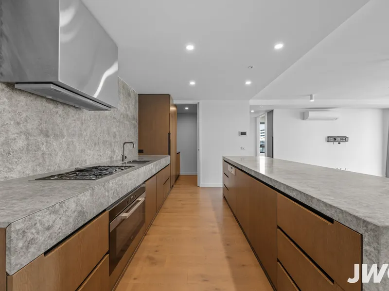 A light-filled and spacious open plan living and dining zone sweeps seamlessly through floor-to-ceiling glazing to an expansive North facing terrace with unforgettable views of the CBD and beyond and is further complimented by a state-of-the-art kitchen equipped with marble bench-tops, breakfast bar, integrated fridge and Gaggenau appliances with indoor BBQ. To further maximise the sense of space, the second bedroom has been conveniently opened up to form part of the living zone, enjoying terrace access and providing the perfect setting for a separate dining or home office.