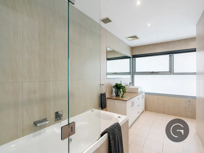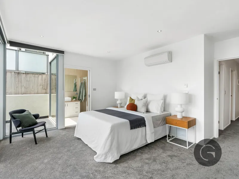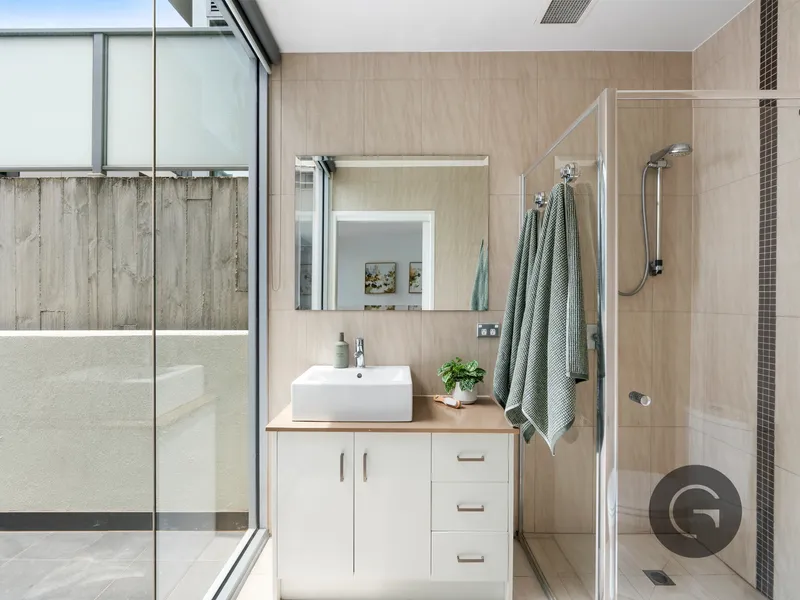 Downstairs, two generously proportioned bedrooms provide tranquil retreats, each thoughtfully positioned for privacy. The master suite is enhanced by a walk-in-robe, a beautifully appointed ensuite and direct access to a private balcony, creating a serene sanctuary to begin and end each day. The second bedroom features built-in-robes and is serviced by a sophisticated central bathroom with full-sized bath, complemented by a separate laundry for added convenience.