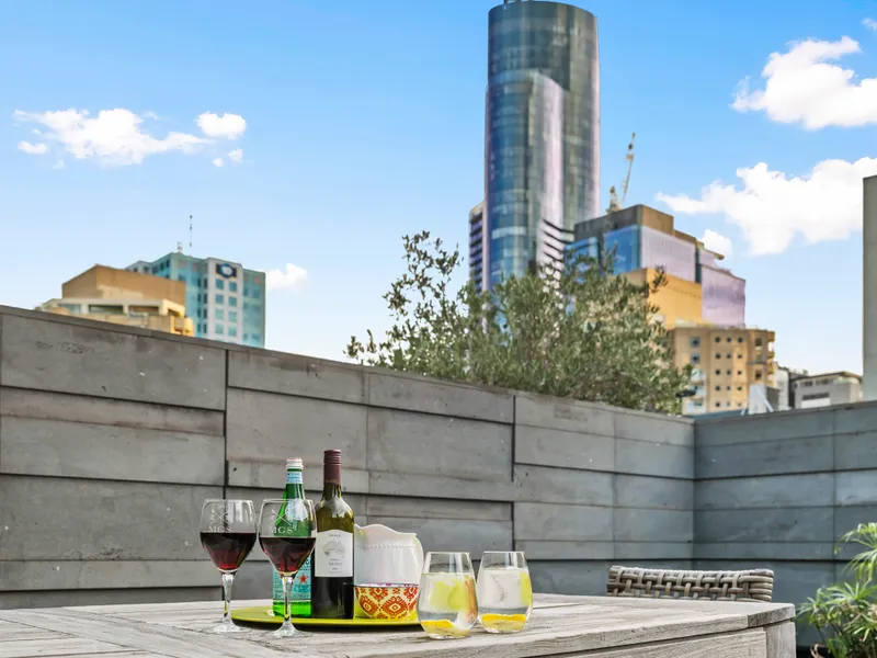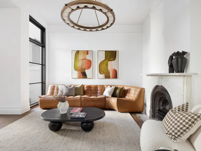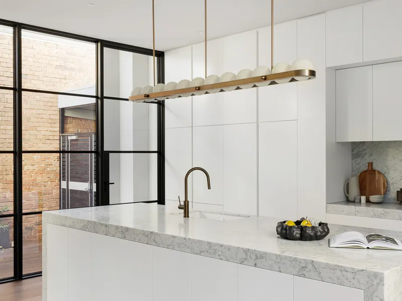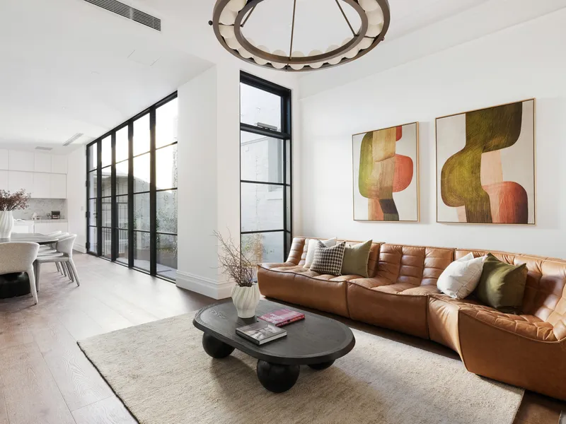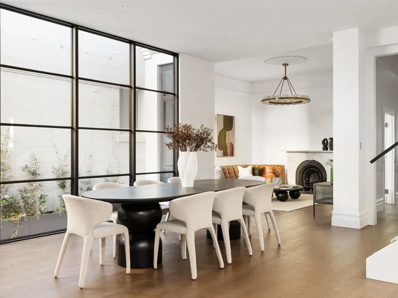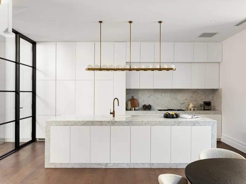 At the heart of the home, expansive open-plan living and dining areas are bathed in natural northern light through striking steel-framed windows. The designer kitchen is finished to the highest standard, featuring Calacatta marble benchtops and splashback, bronze tapware, bespoke lighting and a full suite of Miele appliances including dual ovens, 900mm gas cooktop, integrated fridge and dishwasher. Two private alfresco terraces, framed by lush greenery and original brickwork, create the perfect setting for entertaining, with direct access through the garage to the park beyond.