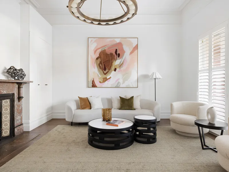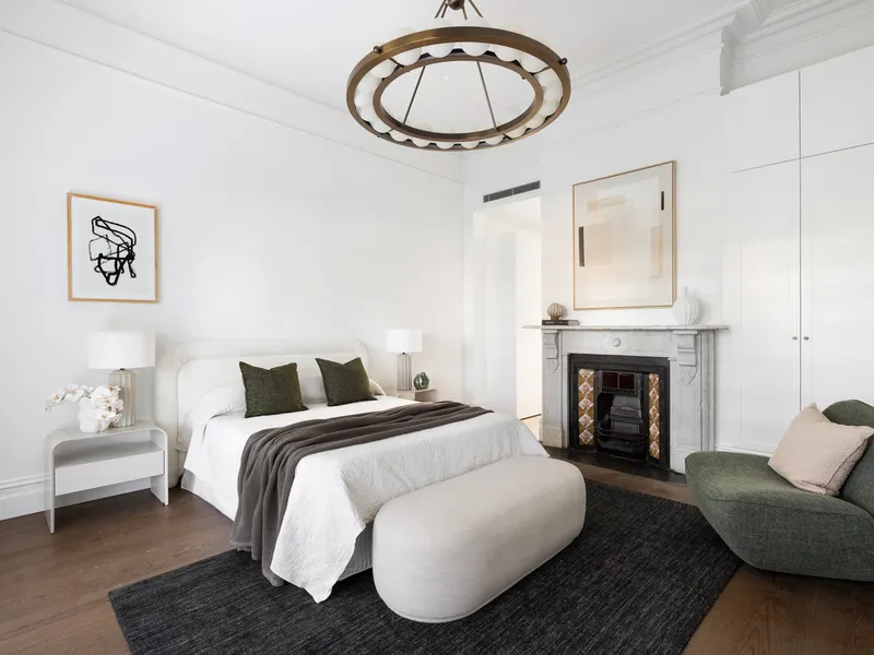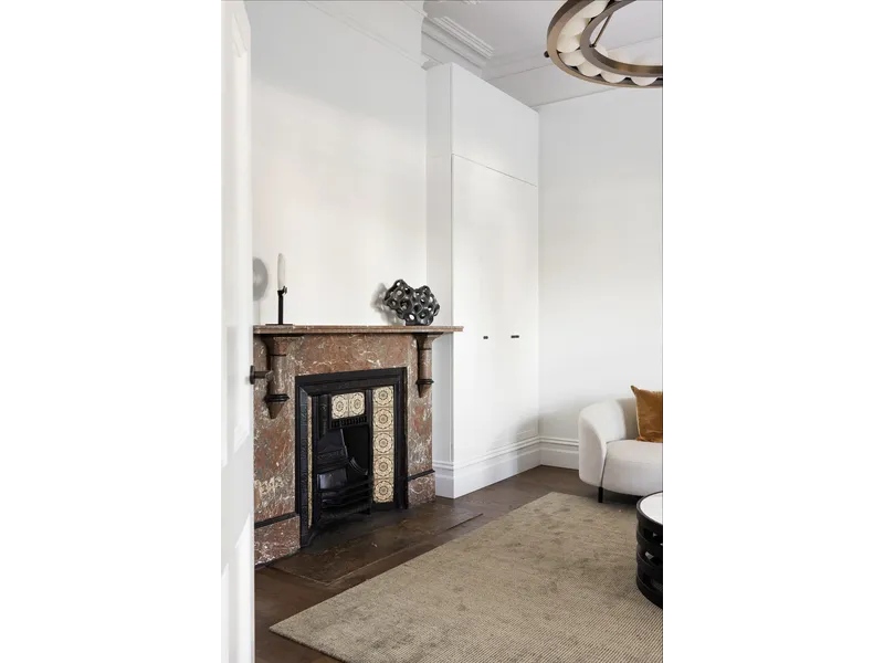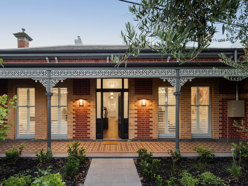 A beautifully landscaped formal garden and tessellated verandah welcome you inside, where a skylit entrance hall reveals soaring ceilings and wide oak flooring flowing throughout. A refined formal sitting room with marble fireplace offers flexibility as a secondary living zone or additional bedroom, while the luxurious main suite is a true retreat, complete with leafy outlooks, original fireplace, extensive robes, a walk-through dressing area and a designer ensuite framed by tranquil greenery. A second bathroom on the ground floor continues the home’s sophisticated, spa-like aesthetic.
