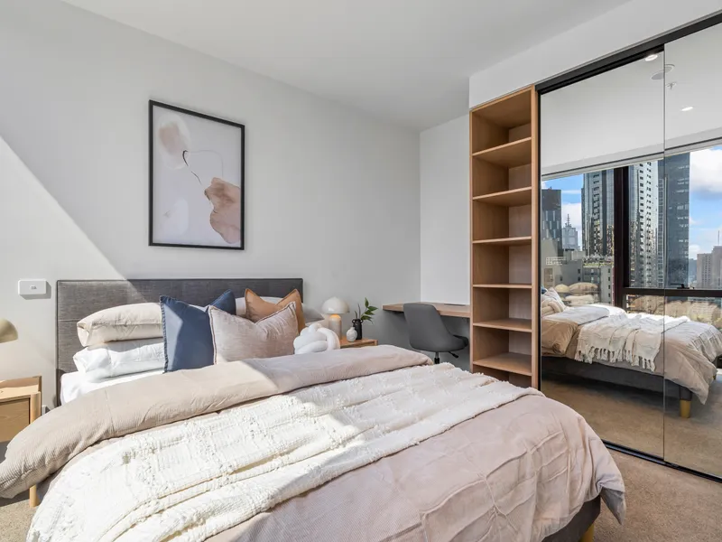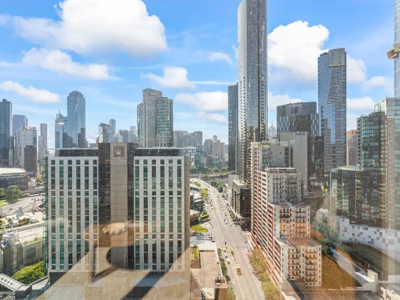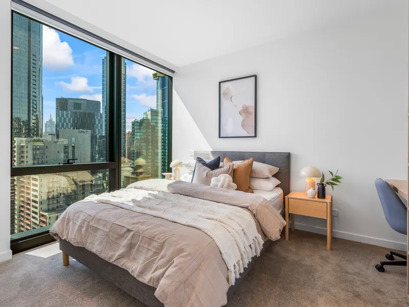 Positioned on the 24th floor of the New Queensbridge Tower, this stylish Fully Furnished one-bedroom residence captures spectacular views of Melbourne's skyline. Floor-to-ceiling windows frame the outlook and allow natural light to flow throughout, the open-plan living and dining zone forms the heart of the home, finished with timber floorboards, the gourmet kitchen with stone bench tops including breakfast bar bar offering a functional layout for both daily living and entertaining while maintaining connection to the main living zone.
