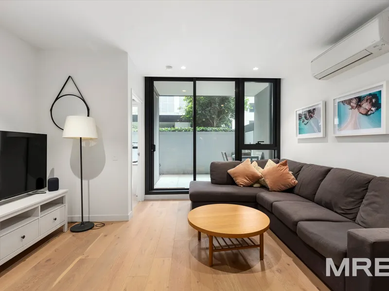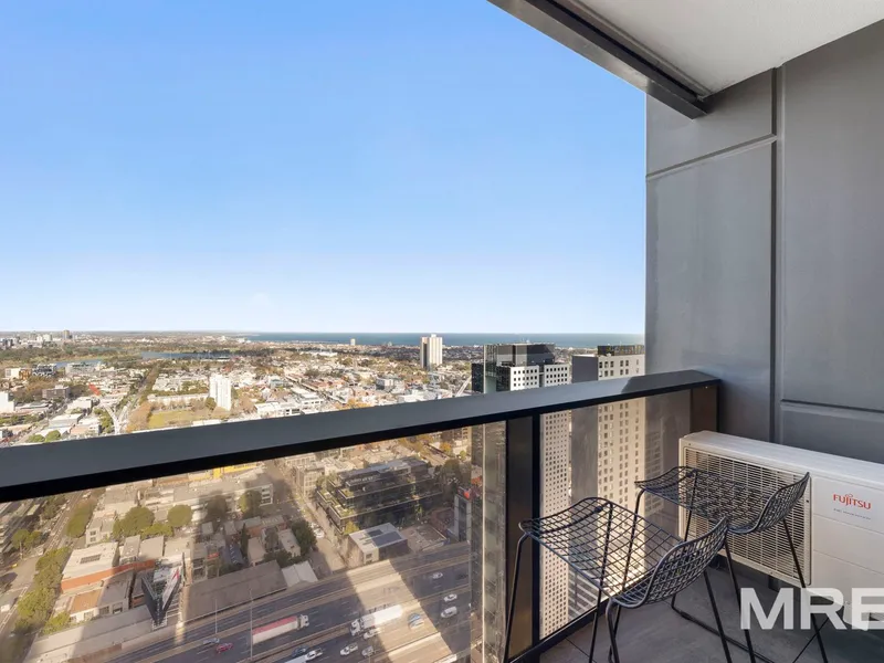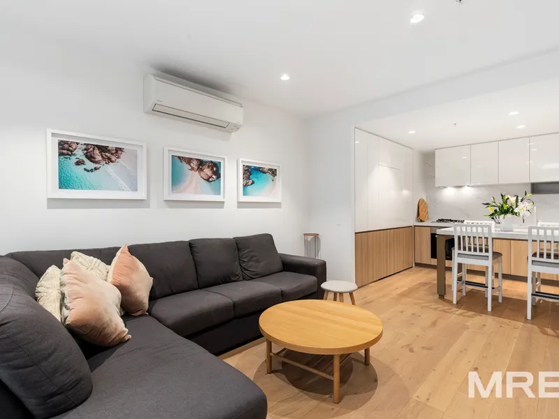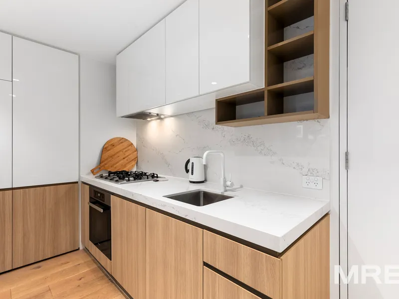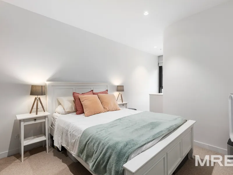 The bedroom includes mirrored built-in robes and offers a peaceful retreat high above the bustling streets below. A fully-tiled central bathroom features quality finishes, and the European laundry comes complete with a washing machine and dryer, plus a fridge included - ready for you to move straight in.