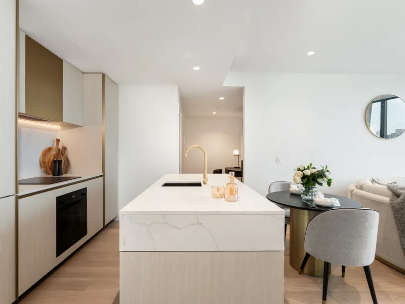 The open-plan living space flows seamlessly onto a private balcony, filling the apartment with natural light and offering spectacular city views from the 37th floor. The kitchen is spacious and well-appointed, featuring sleek stone benchtops, stainless steel Bosch appliances including a dishwasher, gas cooktop, and integrated oven.