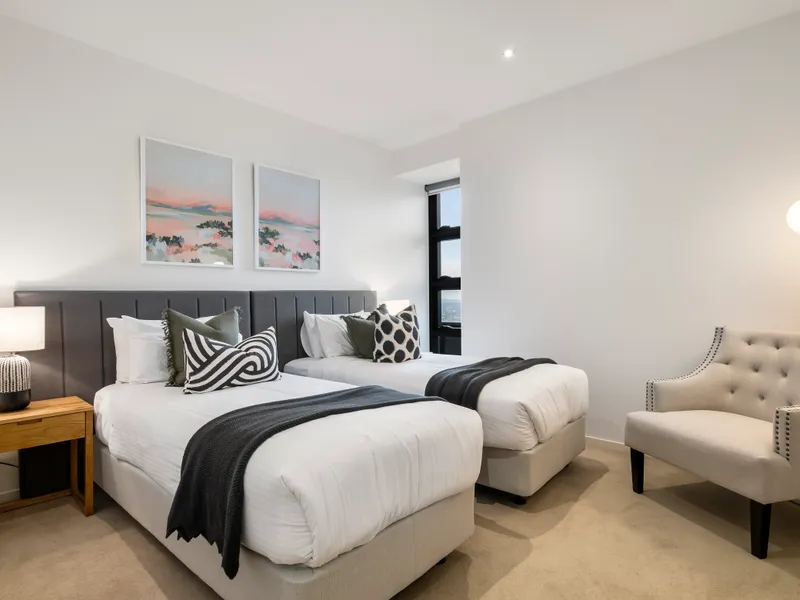 Inside, the flexible floorplan offers light-filled open-plan living and dining, complemented by a sleek, stone-appointed kitchen featuring a waterfall-edge breakfast bar and quality stainless-steel appliances, including a dishwasher. Floor-to-ceiling glass frames the living space and opens onto a private east-facing balcony capturing sweeping neighbourhood skyline views with a picturesque glimpse of Port Phillip Bay.