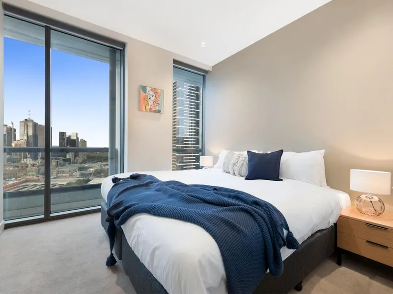 Located on the east side of the 33rd floor,this luxury apartment is superbly furnished and includes a modern kitchen with Smeg European appliances and plenty of marble-top bench space. The master bedroom, with queen size bed, is entered through a spacious walk-through robe and has its own tasteful marble-fitted ensuite bathroom. The second bedroom is equipped with two comfortable single beds. The view of Melbourne and the Yarra River from the two balconies is simply stunning, even more so at night. The open-plan living area has a 42 inch TV, in the unlikely event that you tire of the view.