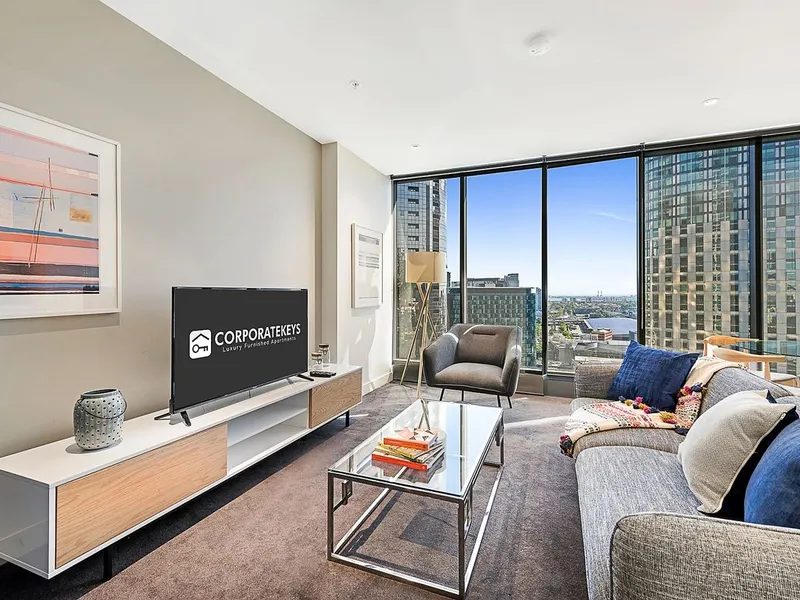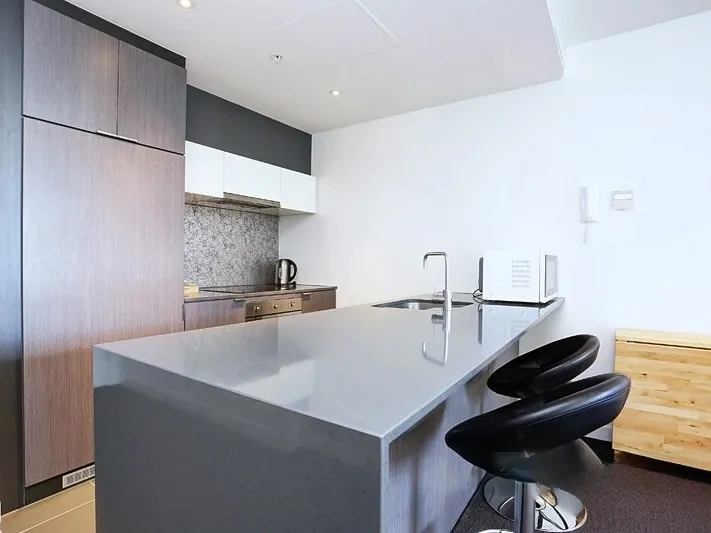 Set on the 32nd floor, the apartment enjoys captivating city views and a thoughtfully designed layout. A spacious open-plan living and dining domain flows seamlessly from a well-appointed kitchen, complete with stainless-steel induction cooking, dishwasher, microwave, and refrigerator—fully equipped with quality crockery and cutlery. The living space is beautifully furnished, featuring a dining setting, leather chaise lounge, and television, creating an inviting environment for both relaxation and entertaining.
