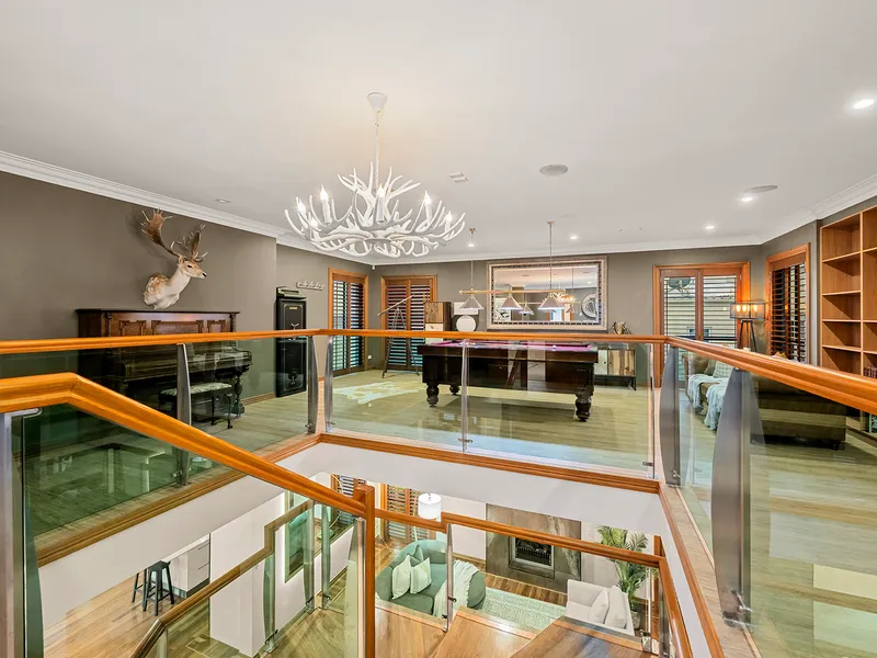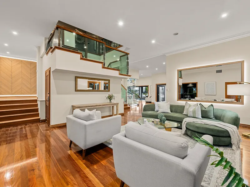 Designed for effortless living and entertaining, multiple living and leisure zones unfold seamlessly throughout the home. A glass-enclosed wine cellar, enclosed media room and expansive open-plan living and dining areas form the heart of the residence, enhanced by feature stonework, timber flooring and seamless indoor–outdoor connection. At the centre, the chef's kitchen pairs new white marble benchtops with updated cabinetry facias and premium Miele and Smeg appliances, overlooking the glass-enclosed indoor pool, ingeniously engineered with structural panels that allow the space to convert into a functional dining platform.