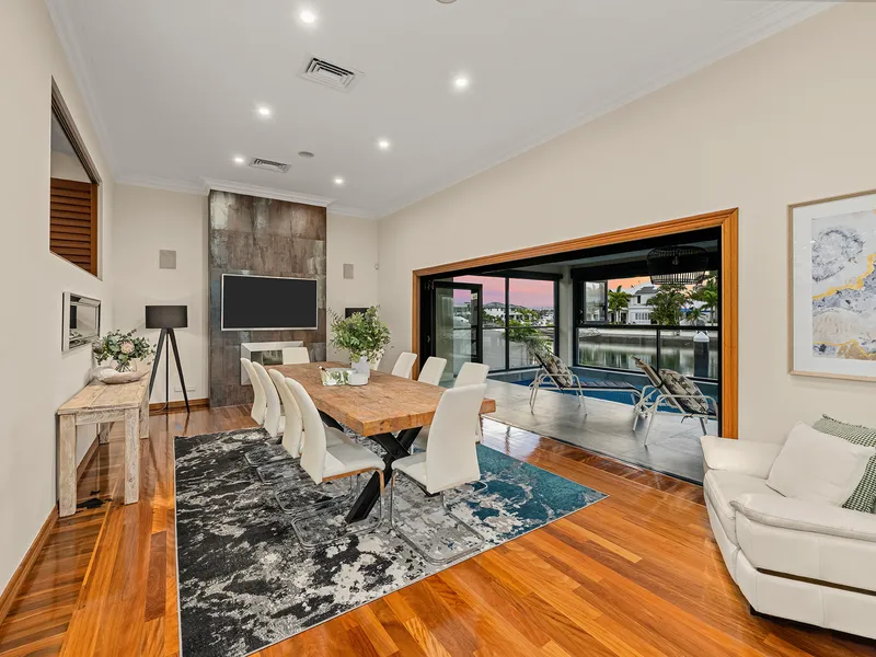 An impressive expression of scale, craftsmanship and waterfront living, this point-position residence delivers timeless luxury within the exclusive Sovereign Islands enclave. Set on a prized block with panoramic bay views from both sides, it enjoys wide water frontage, easy boat manoeuvrability and a heightened sense of privacy. Built as a private family home by one of the Gold Coast's longest-standing development families, the residence reflects enduring quality, thoughtful design and a floor plan regarded as one of the most functional on the island. Soaring ceilings, expansive proportions and tranquil bay outlooks define a light-filled environment across both levels.