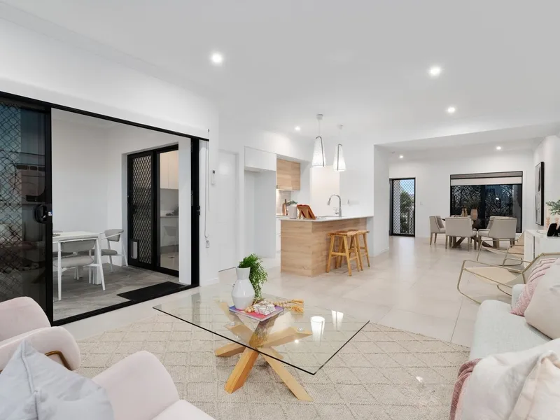 The open-plan kitchen is a chef's dream, featuring a stone benchtop, a gourmet kitchen with a butler's pantry, and double stacker doors that seamlessly connect to the expansive living and dining areas. The master suite is a true retreat, with an en-suite bathroom, while the fourth bedroom located downstairs provides convenience for guests or multi-generational living.
