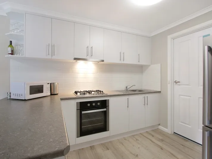 The modern kitchen is well equipped for everyday convenience, featuring a gas cooktop, generous pantry storage and ample preparation space. Its thoughtful design ensures everything is within easy reach, making meal preparation simple and efficient while remaining connected to the living and dining areas.