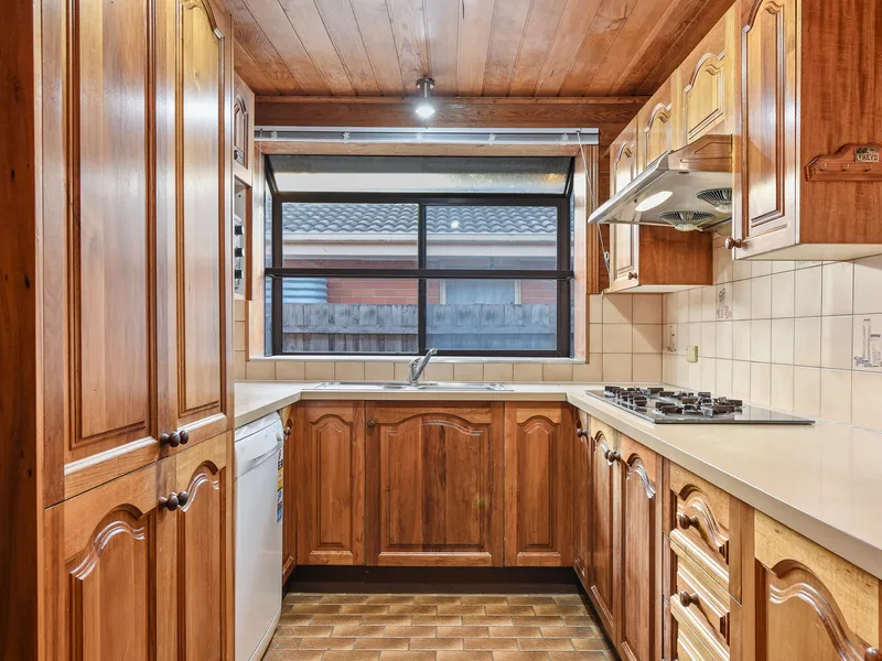 The kitchen features a breakfast bar, laminate benchtops, shaker-style cabinetry. Dishwasher and a gas burner cooktop. A double bowl overmount sink with mixer tapware completes the space.