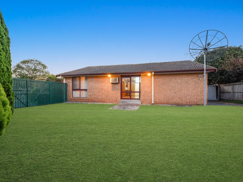 The traditional brick-veneer façade give the home street appeal. Lush greenery envelops the frontage, while a portico offers a welcoming ambiance. A long driveway leads to a vehicle access gate and an oversized single lock-up garage, ensuring ample space for off-street parking and storage.