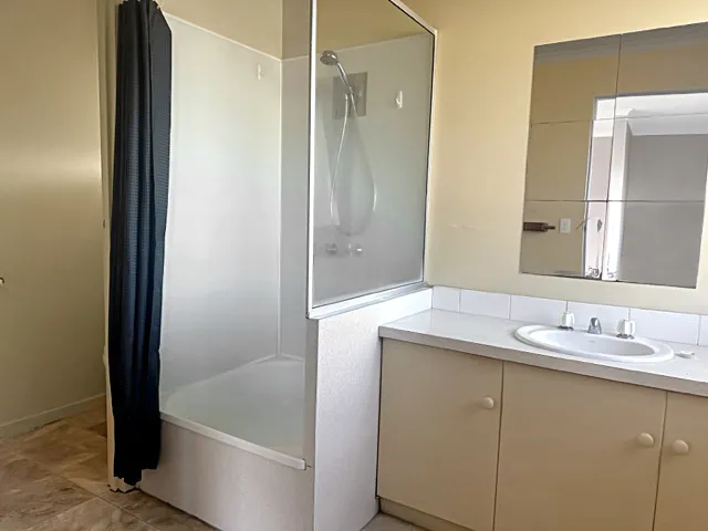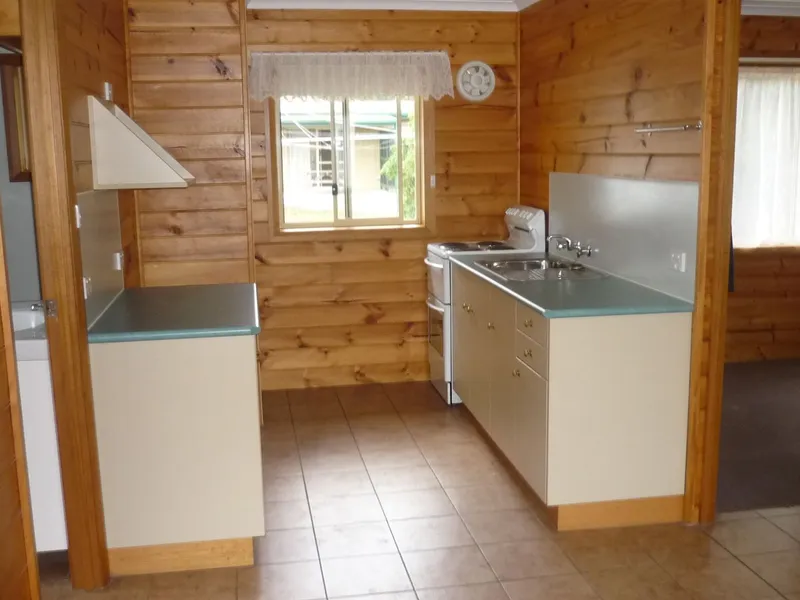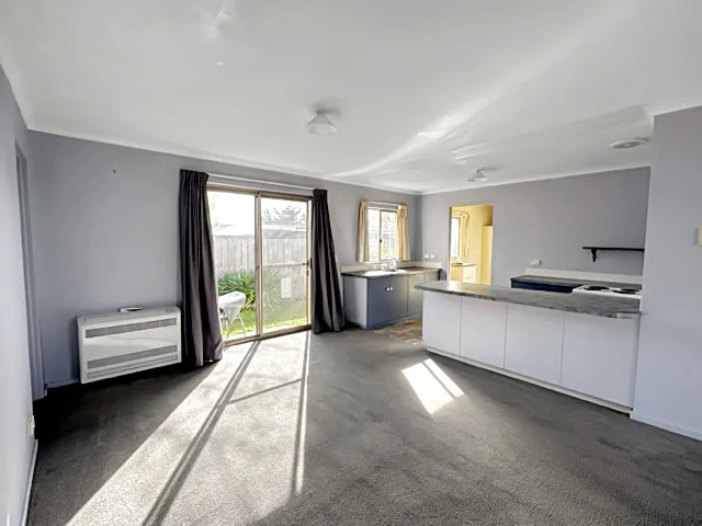 Inside, the home features a practical kitchen with good storage, an electric upright stove and central island bench, flowing into open plan living area. Both bedrooms are well sized, and the bathroom includes a hip bath with overhead shower, vanity and toilet. There is also a separate laundry for added convenience.