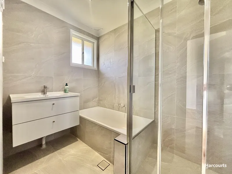The home features three well-proportioned bedrooms, a functional kitchen equipped with electric appliances and ample cupboard space, and a renovated bathroom complete with a separate shower, full-sized bathtub, and separate toilet for everyday convenience.
