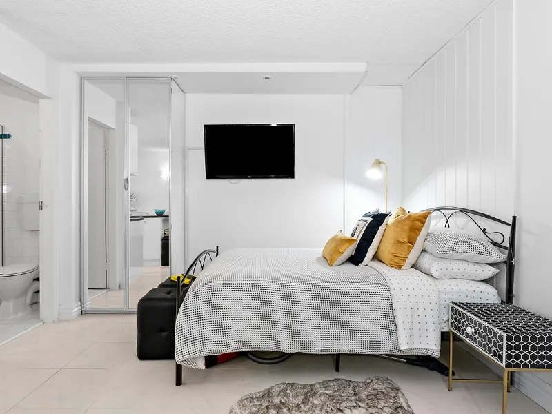 The spacious master bedroom includes a luxurious 5 star hotel quality king sized bed with a deluxe ensuite, television, walk in robe and views out over St Kilda.