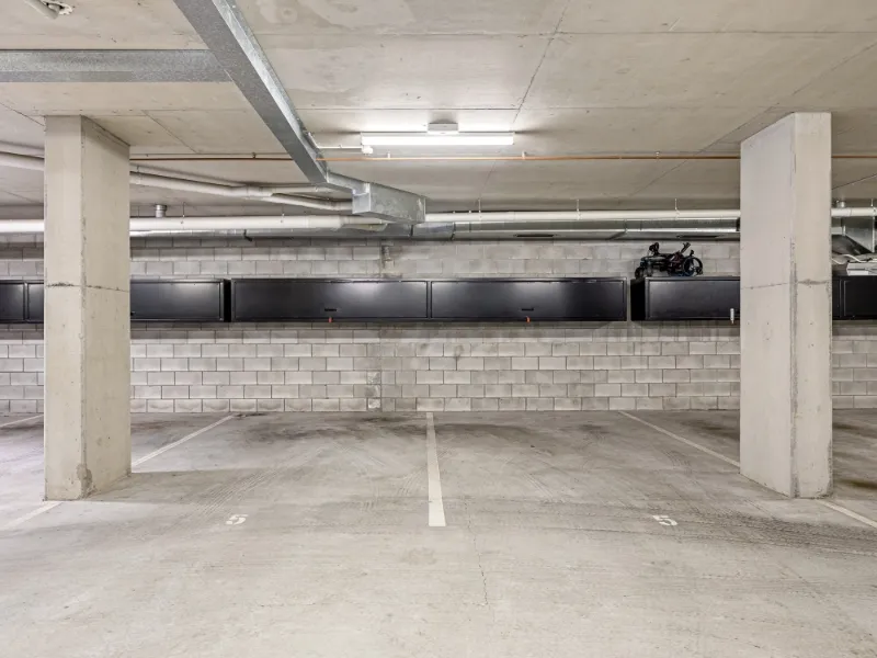 • Two side-by-side basement car spaces plus lockable storage cabinetry