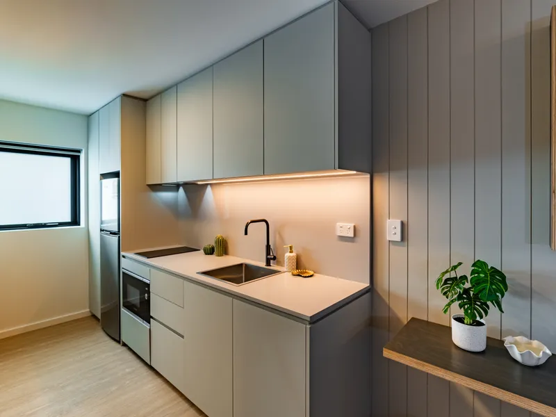 - Open plan living/kitchen with integrated dishwasher and gas cooking.