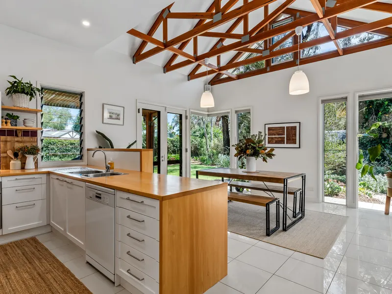• Elegant pitched ceilings with exposed rafters