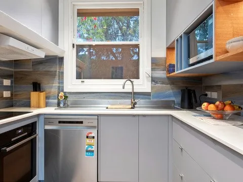 - Centrally located, stylish Spacecraft kitchen featuring stone benchtops, Bosch pyrolytic oven, and induction cooktop