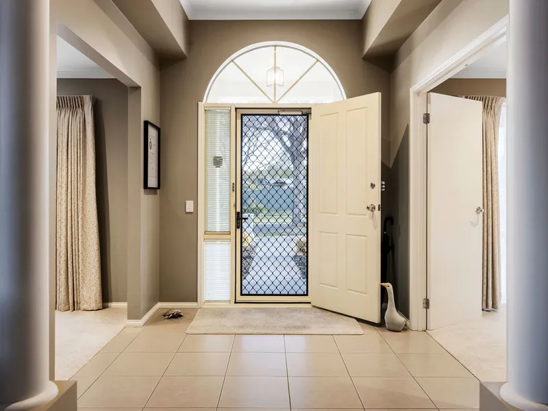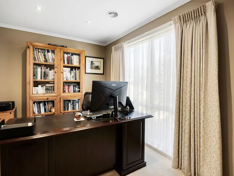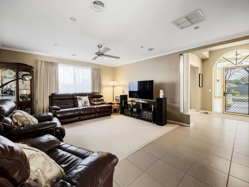 Step inside the wide, welcoming formal entry to discover a spacious home office or third living space, perfect for working from home or relaxing. The formal lounge flows seamlessly into the open-plan kitchen, dining, and living area, creating a bright and inviting hub for family life. Glass sliding doors from the main living area open onto the outdoor entertaining space, including a fully fenced alfresco area and paved courtyard, ideal for gatherings and year-round enjoyment.