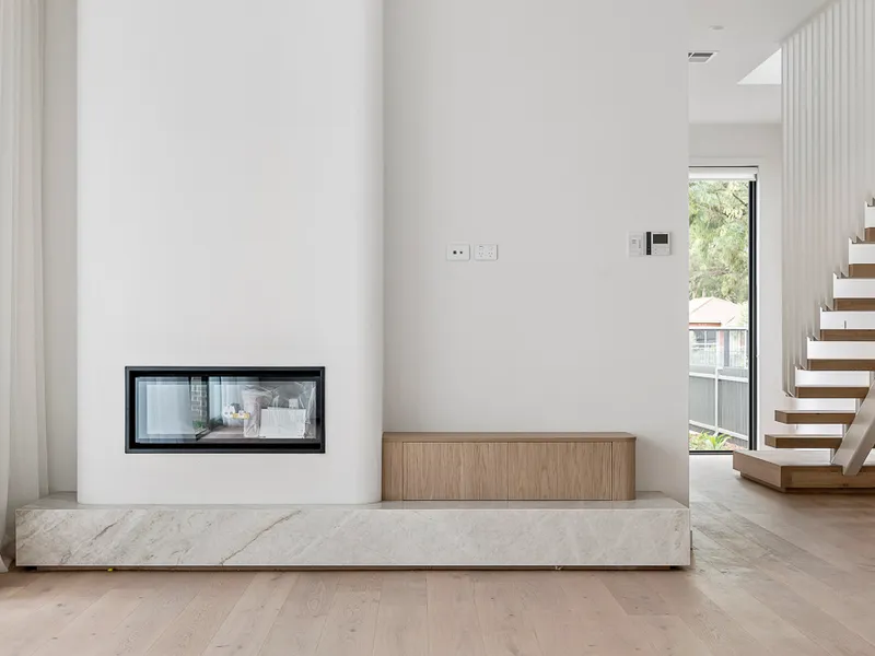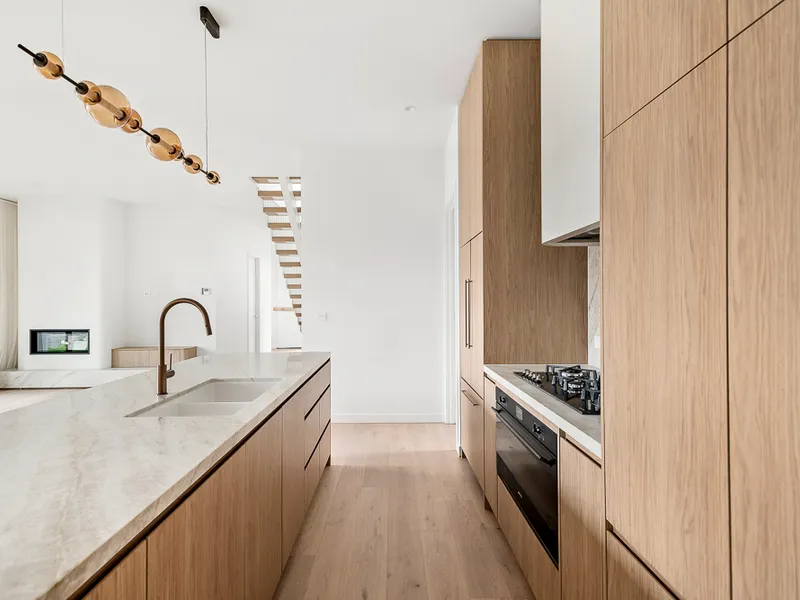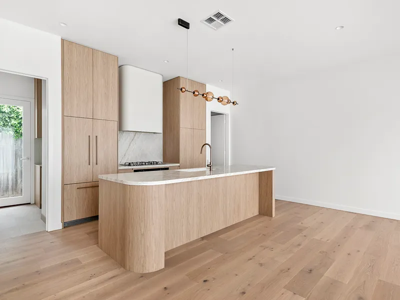 Modern state of the art kitchen with butlers pantry, stone benchtops, integrated fridge and dishwasher & Smeg cooking appliances.
