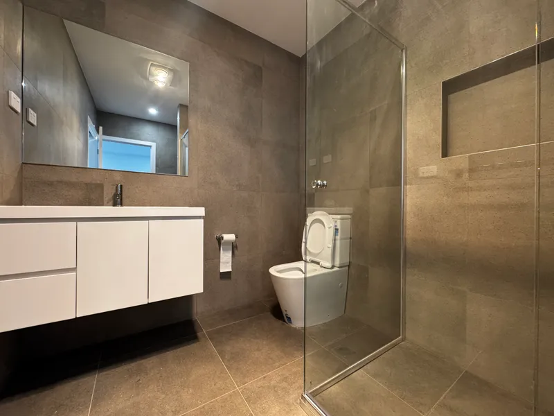 Both bedrooms are generously sized and easily accommodate queen-size beds, each offering excellent storage with built-in wardrobes. The centrally located bathroom is designed for convenience and finished with full-height tiling, adding a modern and elegant touch.