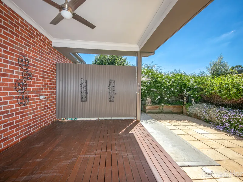 Indulge in the tranquility of your decked alfresco area, complete with an exterior fan to keep you cool on warm summer evenings. Beyond lies a private courtyard adorned with charming pavers and surrounded by picturesque timber-edged beds bursting with vibrant flowers-a serene oasis for quiet reflection or outdoor gatherings with loved ones.