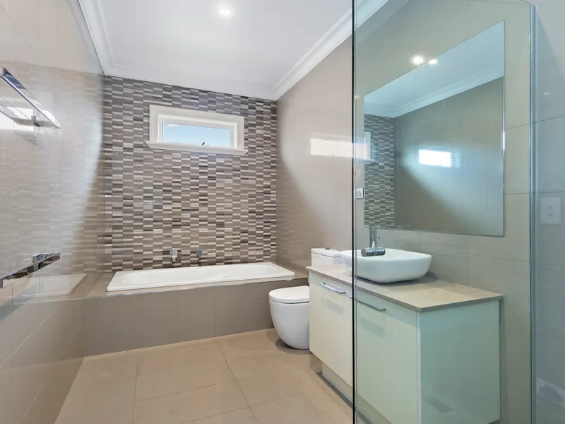 • Main bathroom featuring bathtub, shower and elegant mosaic feature tiling