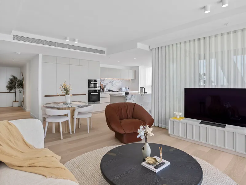 With a contemporary kitchen, dining, and living area that opens onto a huge private balcony with seating for alfresco dining.