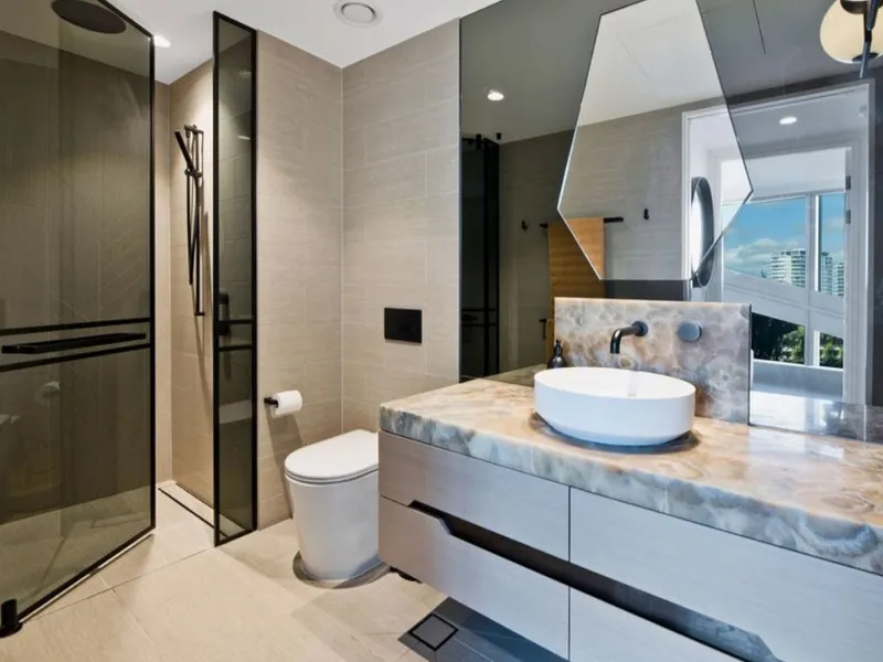 - Bedroom boasts ocean views, balcony access, a walk-in robe, and elegant ensuite with 18mm Gun Smoke Onyx vanity, shower, toilet and freestanding bath