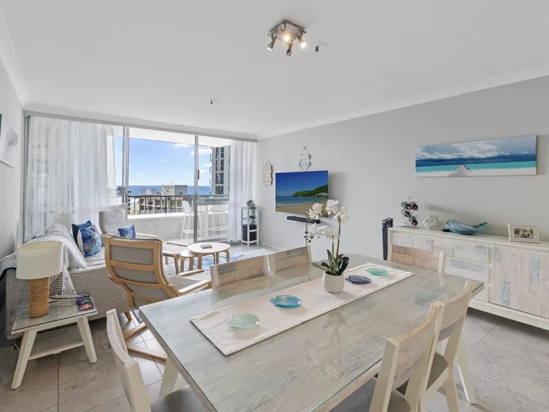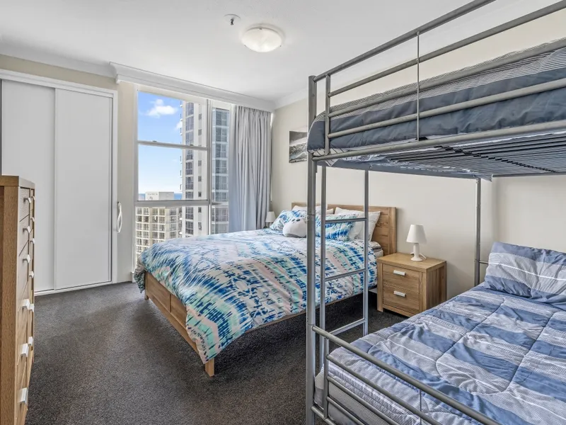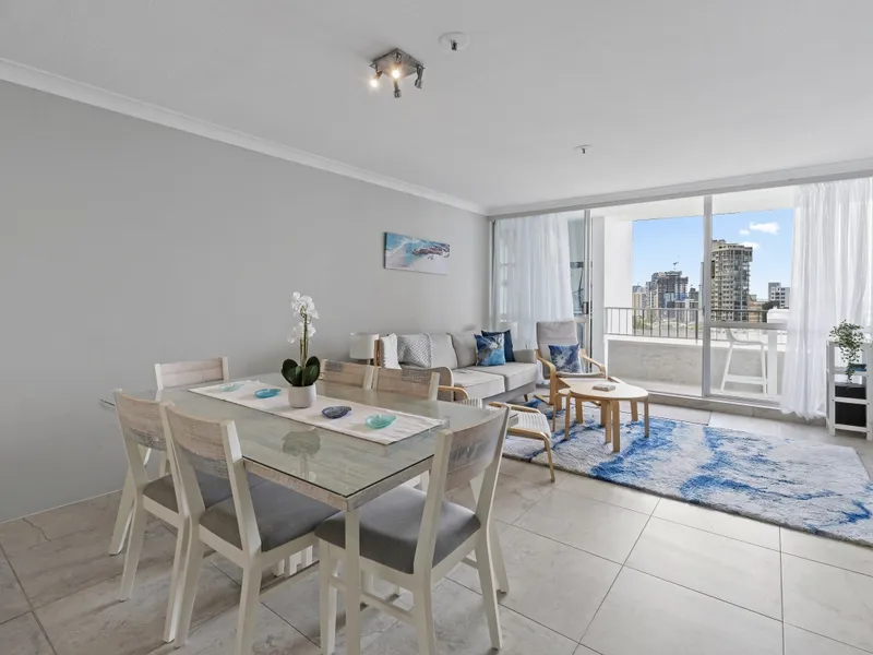 Perfectly positioned on the cusp of Surfers Paradise with views over the tops of the buildings to the stunning Pacific Ocean is this spacious and renovated 2 bedroom 2 bathroom apartment. Sitting high above the twinkling lights on the 17th floor you will never tire of marvelling at the spectacular views that are spread before you. The ever sought after north facing views capture the Broadwater, River and Hinterland. Standing at your kitchen bench will never feel ordinary or mundane again because in this apartment you will have sensational views of the ocean whilst you are cooking up a storm!